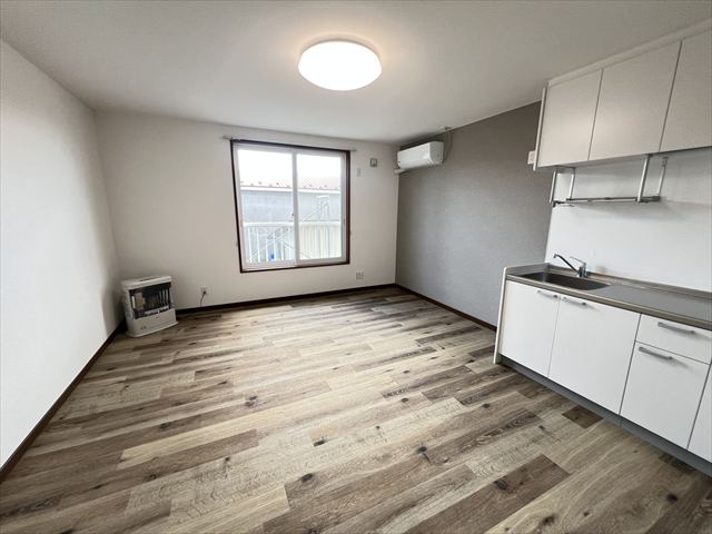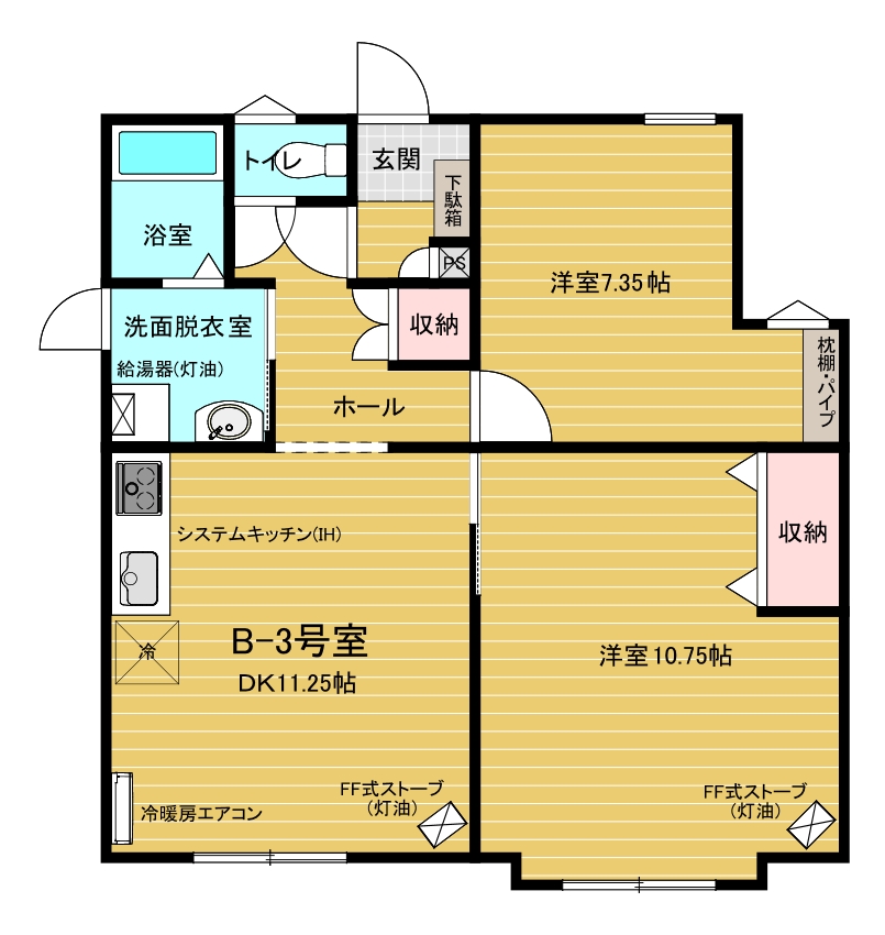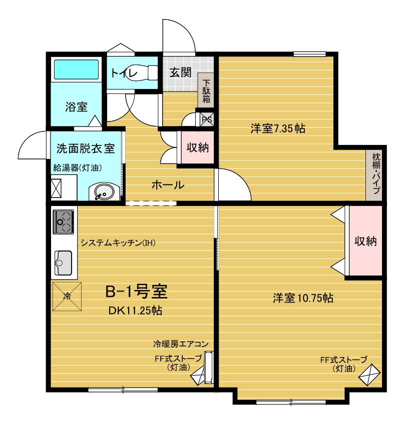 設備等 | ウォシュレット付き水洗トイレ/ユニットバス/洗面化粧台/物干しパイプ/石油給湯器/システムキッチン(IH)/冷暖房エアコン/FFストーブ/インターネット設備/照明器具/各種収納/下駄箱/消火器/ドアホン/郵便受け | ||
