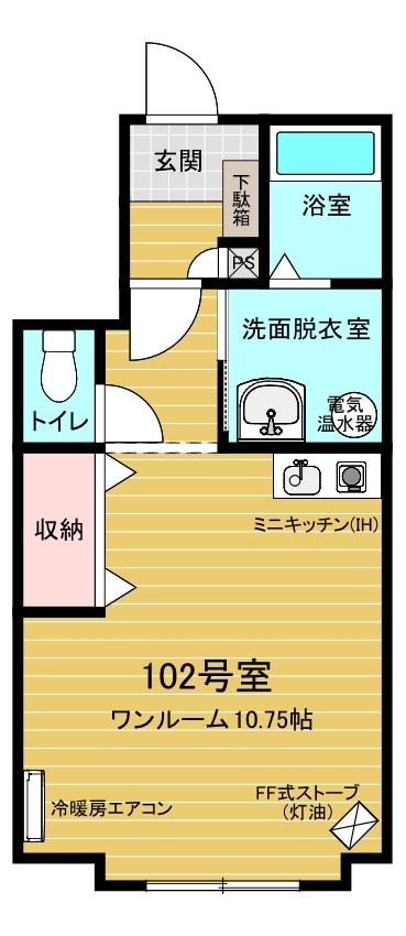 | 設備等 | ウォシュレット付き水洗トイレ/ユニットバス/洗面化粧台/物干しパイプ/電気温水器/ミニキッチン(IH)/冷暖房エアコン/FFストーブ/インターネット設備/照明器具/各種収納/下駄箱/消火器/ドアホン/郵便受け | ||